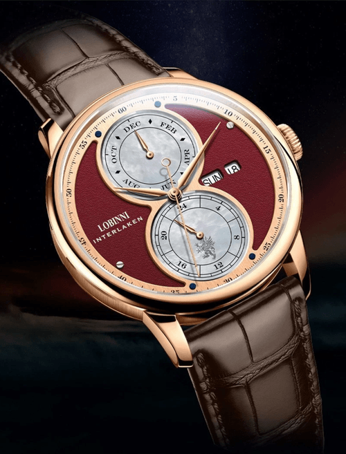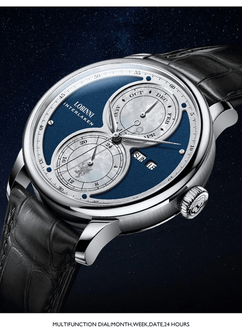 Diese klassisch-elegante Uhr aus dem Hause Lobinni verfügt über eine Reihe an Komplikationen, die sie für Liebhaber komplexer Uhren sehr attraktiv macht. Diese Automatikuhr zeichnet sich durch einen vollumfänglichen Jahreskalender aus und besitzt Anzeigen für Monat, Wochentag und Datum sowie eine 24h Anzeige.
