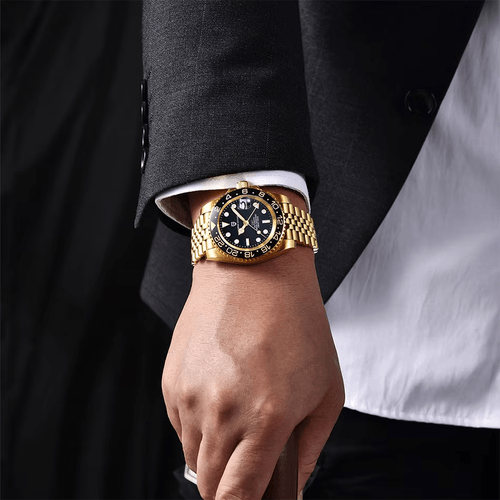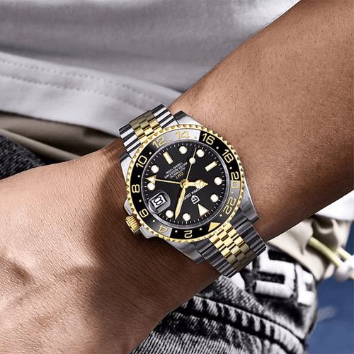 Hommage Uhr von Pagani Design an die berühmte Rolex GMT Master II. Aus robustem 316L Edelstahl in der Farbe Gelbgold. Die Uhr verfügt über ein feines "Jubilee"-Armband und ist erhältlich in Two Tone/Bicolor und Vollgold